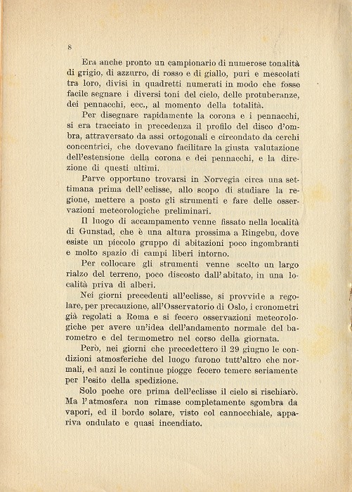 La spedizione qui descritta, con il resoconto delle osservazioni effettuate fu decisa nell’Osservatorio del Campidoglio per osservare l’eclissi del 1927. Fu scelta come sede la penisola Scandinava, in particolare il villaggio di Ringebn, per essere al centro della “linea di totalità” e perché fornito di una stazione ferroviaria e delle migliori previsioni meteorologiche.